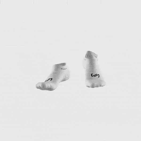 Calcetines bajos con refuerzos en la parte delantera, la cala, talón. Aportan una perfecta sujeción del arco plantar y evitar el movimiento del calcetín, eliminando roces y ampollas.